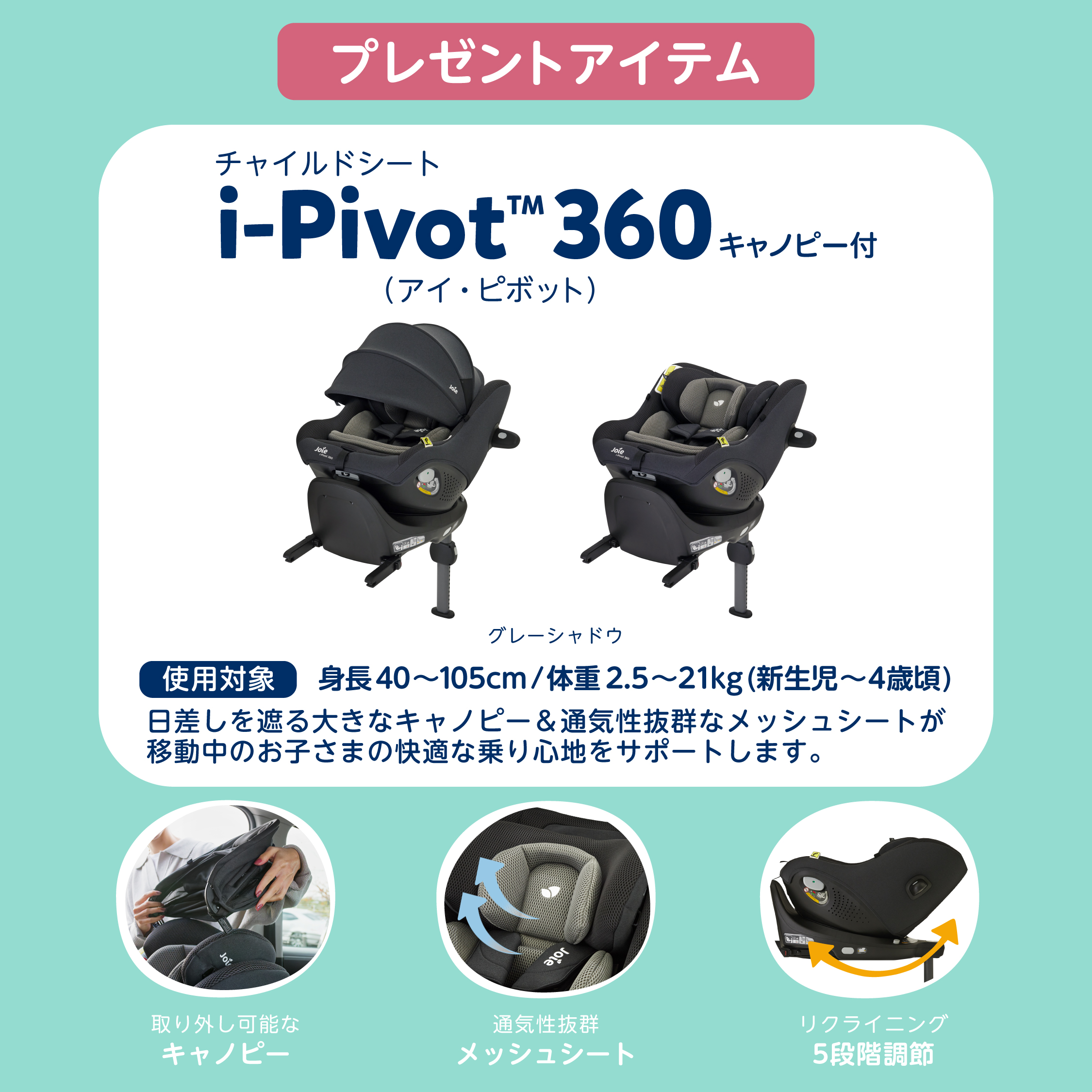 プレゼントアイテムは本日発売開始となった新作チャイルドシート【i-Pivot 360(アイ・ピボット)キャノピー付≪グレーシャドウ≫】♪