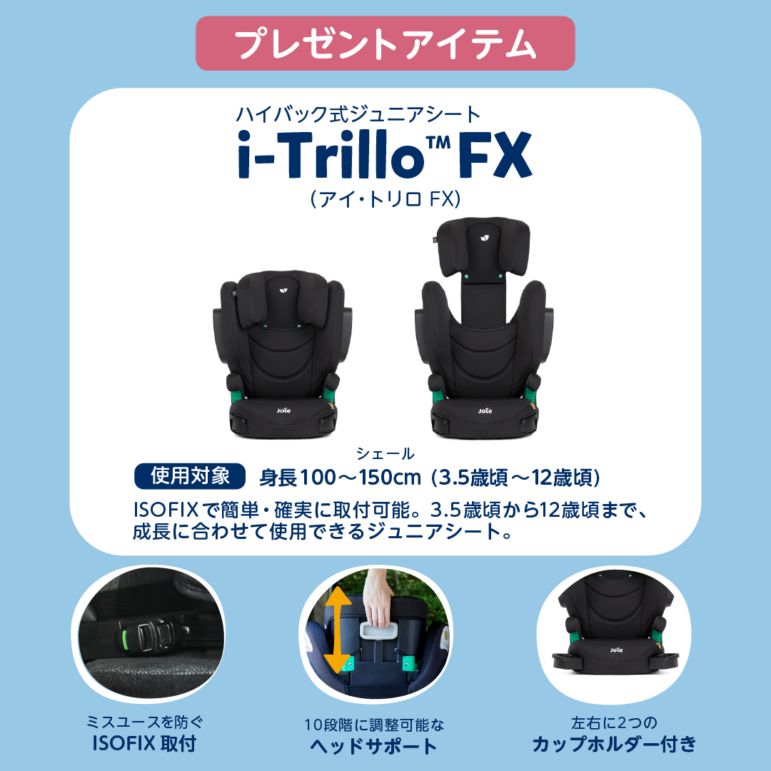 プレゼントアイテムは。ISOFIXで簡単・確実に取り付け可能なジュニアシート【i-Trillo FX(アイ・トリロFX)】です。